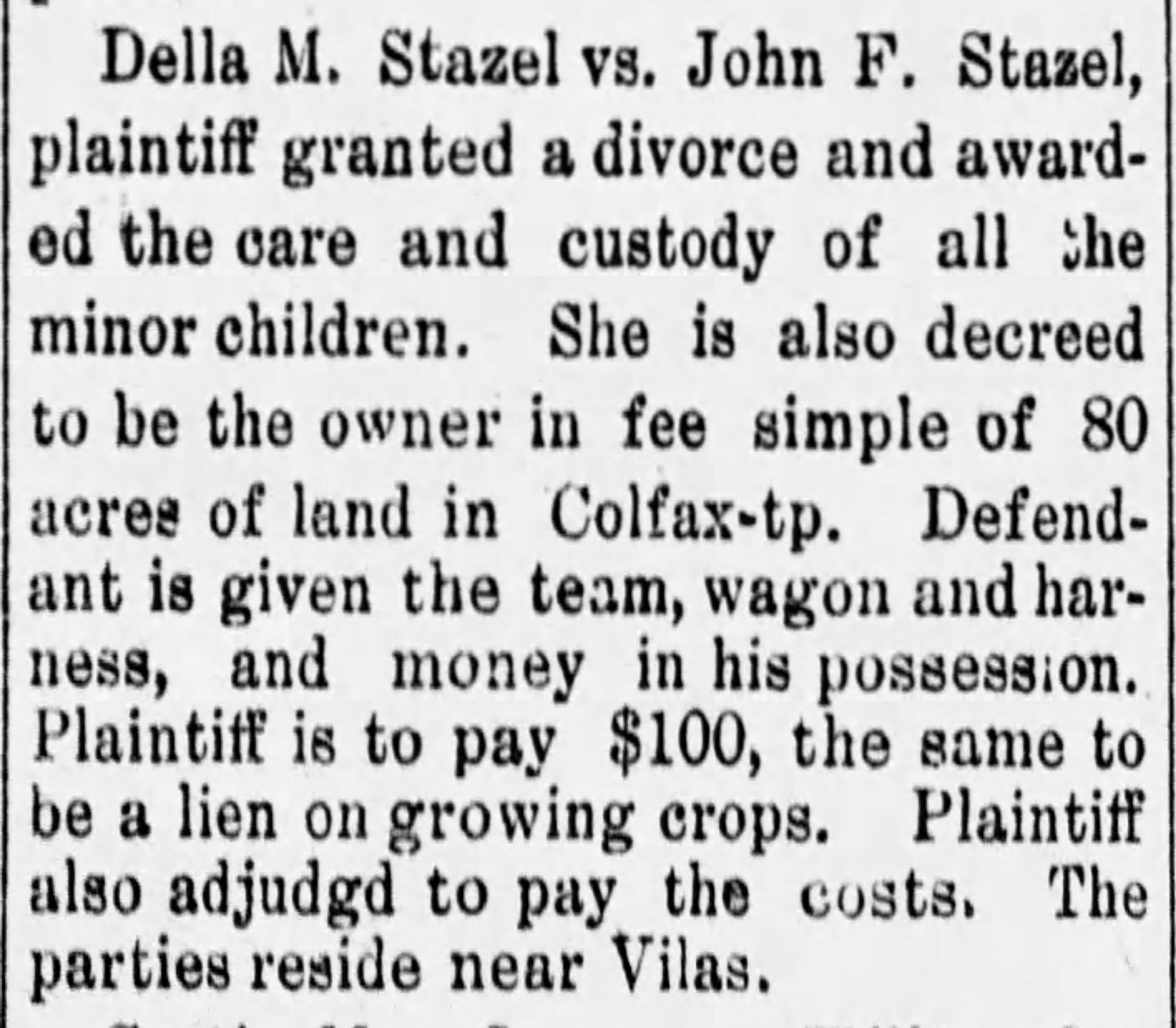 Della M. Stazel vs. John F. Stazel, plaintiff granted a divorce and awarded the care and custody of all the minor children. She is also decreed to be the owner in fee simple of 80 acres of land in Colfax-tp. Defendant is given the team, wagon and harness, and money in his possession. Plaintiff is to pay $100, the same to be a lien on growing crops. Plaintiff also adjudgd to pay the costs. The parties reside near Vilas.