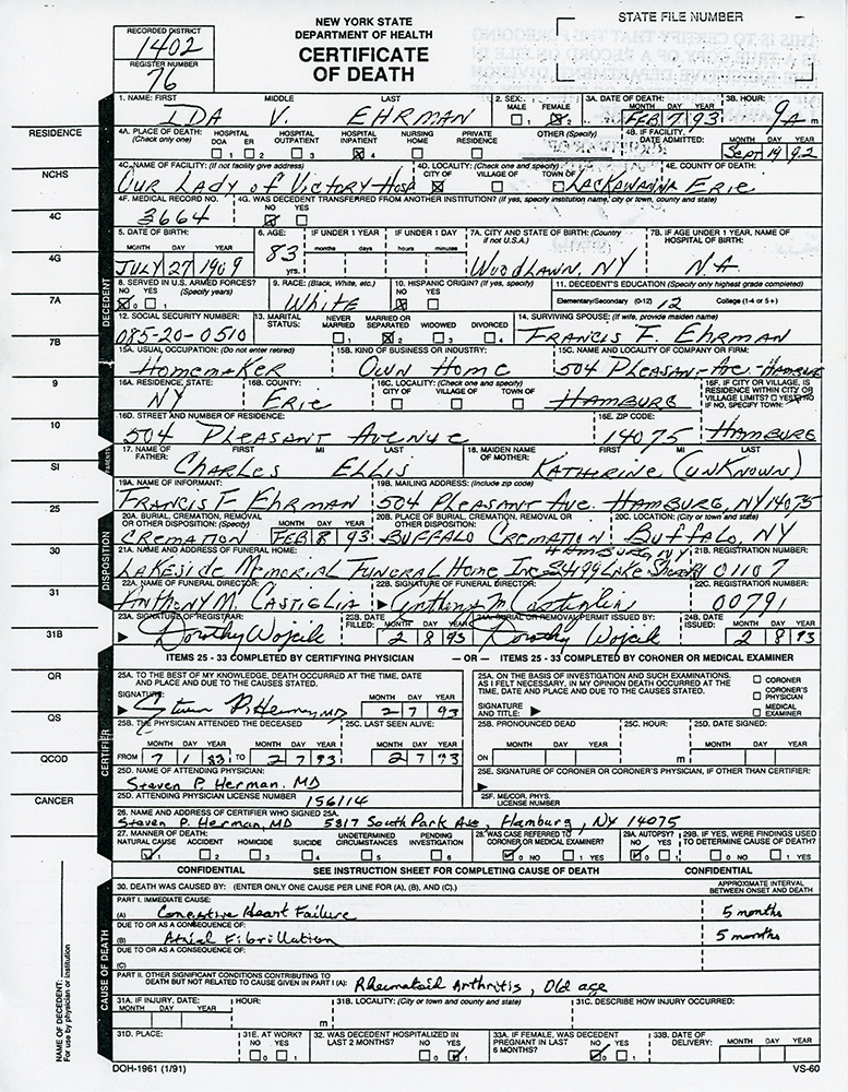 - [S647] Dennis and Ida Hinks Collection, Certificate of Death - Ida V. Ehrman.