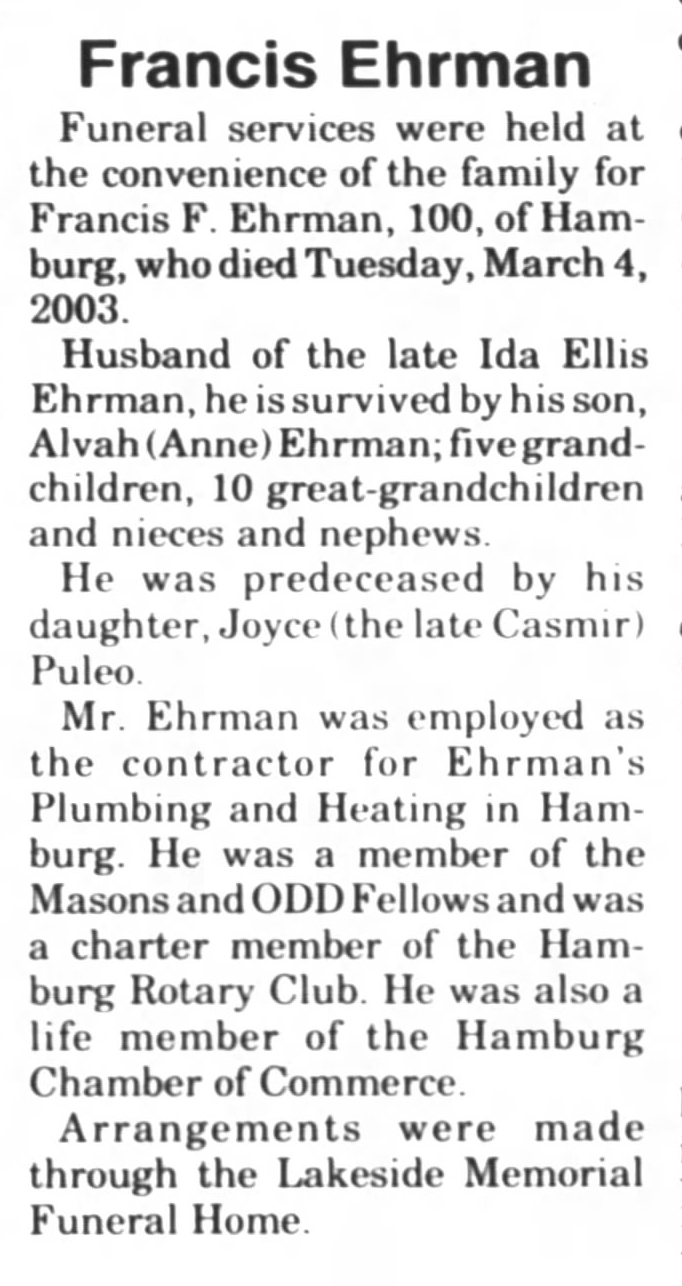 Funeral services were held at the convenience of the family for Francis F. Ehrman, 100, of Hamburg, who died Tuesday, March 4, 2003.