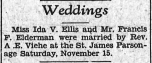 Miss Ida V. Ellis and Mr. Francis F. Elderman were married by Rev. A E. Viehe at the St. James Parsonage Saturday, November 15.