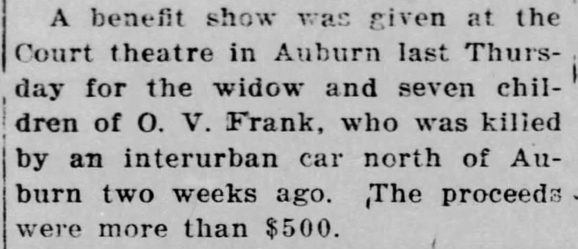 A benefit show was given at the Court theatre in Auburn last Thursday for the widow and seven children of O. V. Frank, who was killed by an interurban car north of Auburn two weeks ago. The proceeds were more than $500.