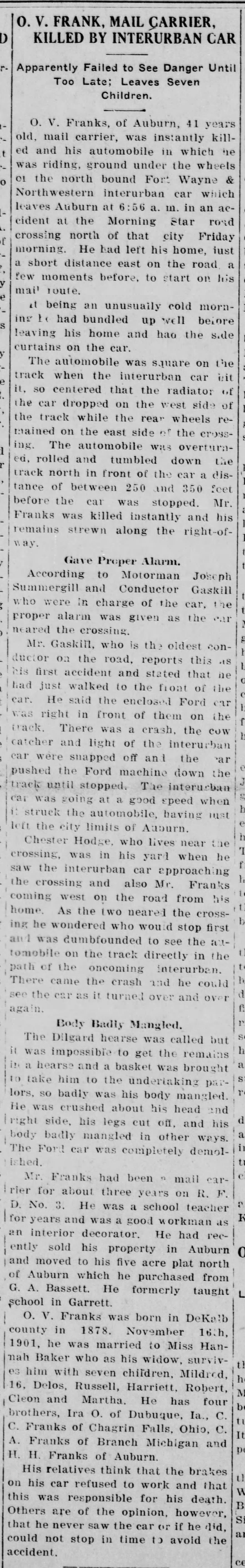 O. V. Frank, of Auburn, 41 years old, mail carrier, was instantly killed and his automobile in which he was riding, ground under the wheels of the north bound Fort Wayne & Northwestern interurban car which leaves Auburn at 6:56 a. m. in an accident at the Morning Star road crossing north of that city Friday morning. He had left his home just a short distance east on the road a few moments before, to start on his mail route.