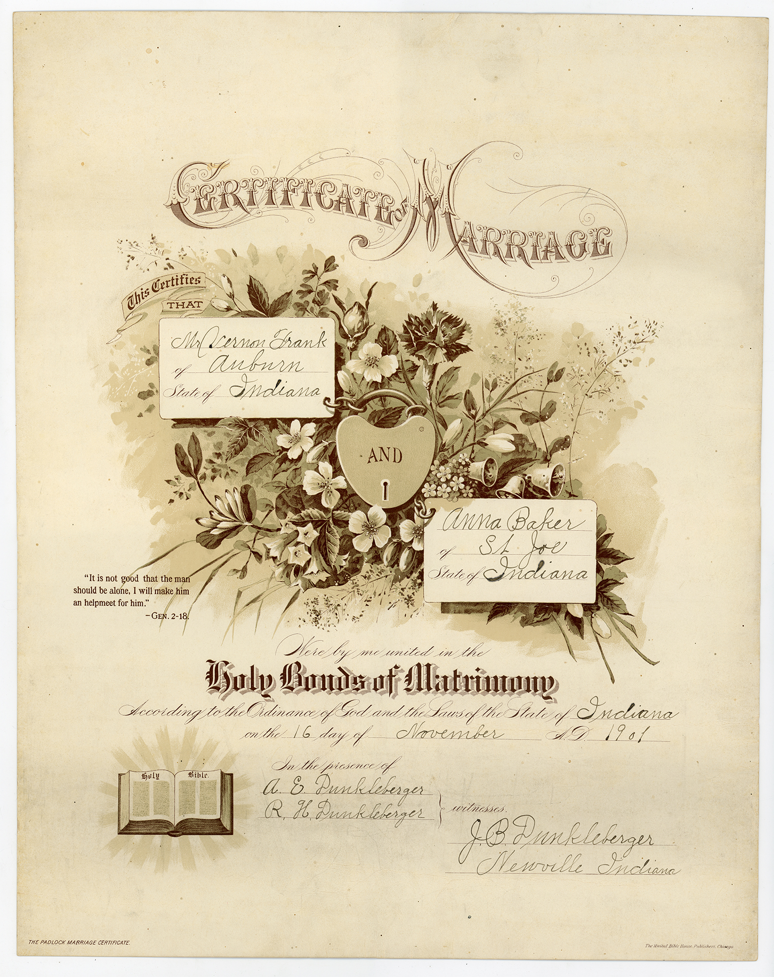 - [S54] Ancestry.com, Indiana, Marriage Index, 1800-1941, (Name: Ancestry.com Operations Inc; Location: Provo, UT, USA; Date: 2005;), Dekalb County, Indiana; Index to Marringe Record 1882 - 1920 Inclusive Let, W. P. A. Original Record Located County Clerk's Of; Book: 17; Page: 13.