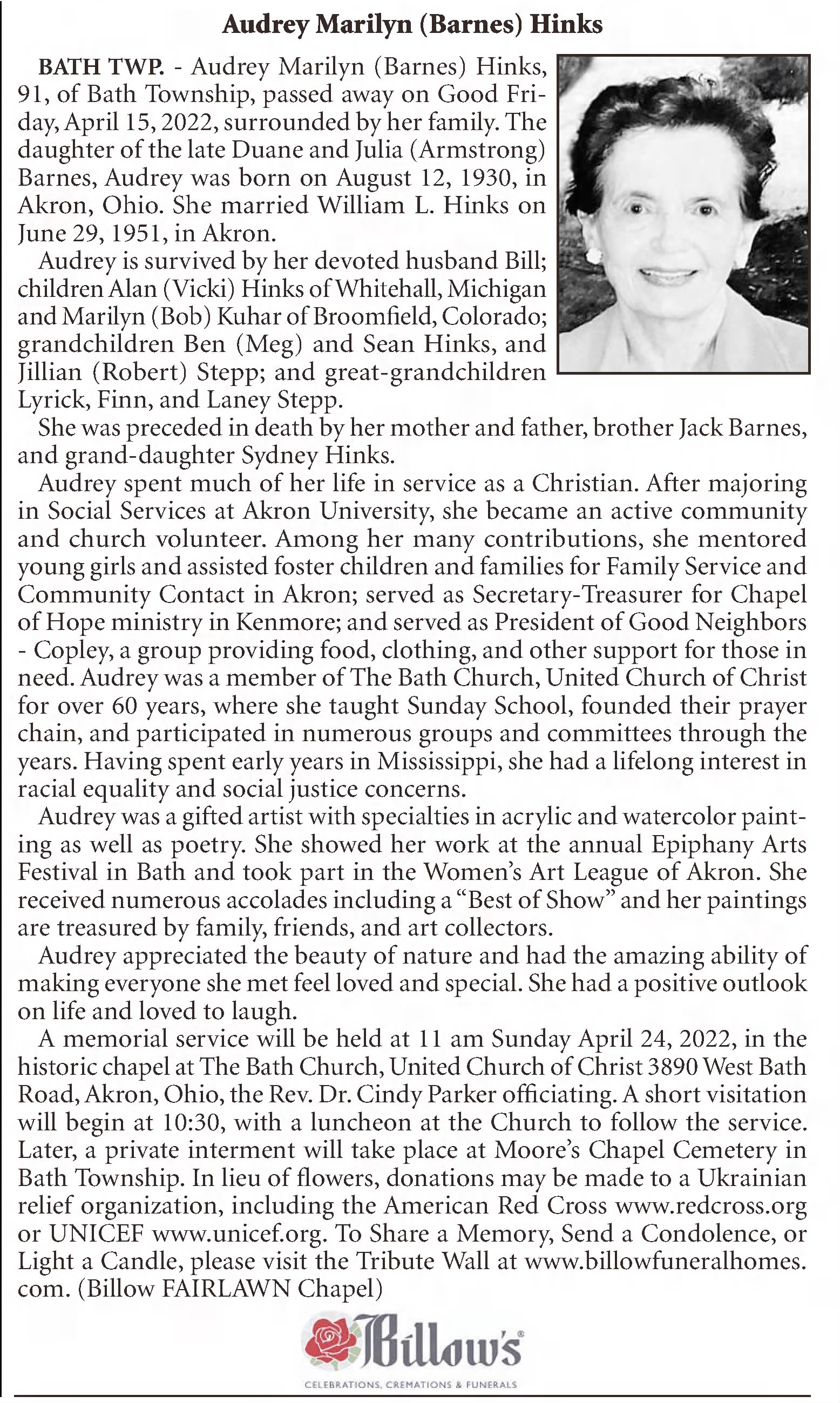 BATH TWP. - Audrey Marilyn (Barnes) Hinks, 91, of Bath Township, passed away on Good Friday, April 15, 2022, surrounded by her family. The daughter of the late Duane and Julia (Armstrong) Barnes, Audrey was born on August 12, 1930, in Akron, Ohio. She married William L. Hinks on June 29, 1951, in Akron.