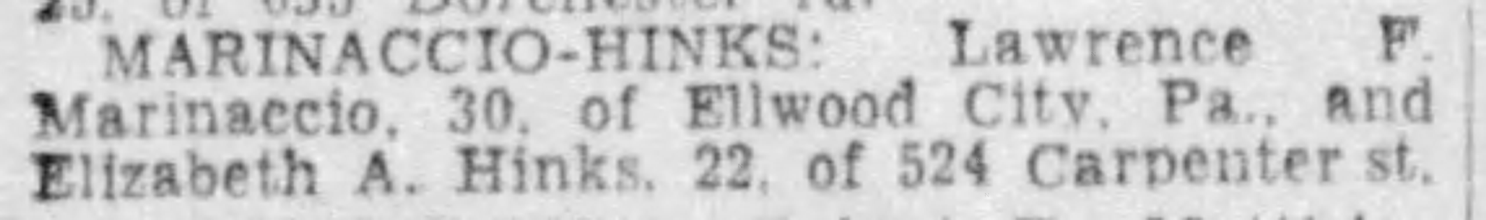 MARINACCIO-HINKS: Lawrence F Marmaccio, 30, of Ellwood City, Pa., and Elizabeth A. Hinks, 22, of 524 Carpenter tt.