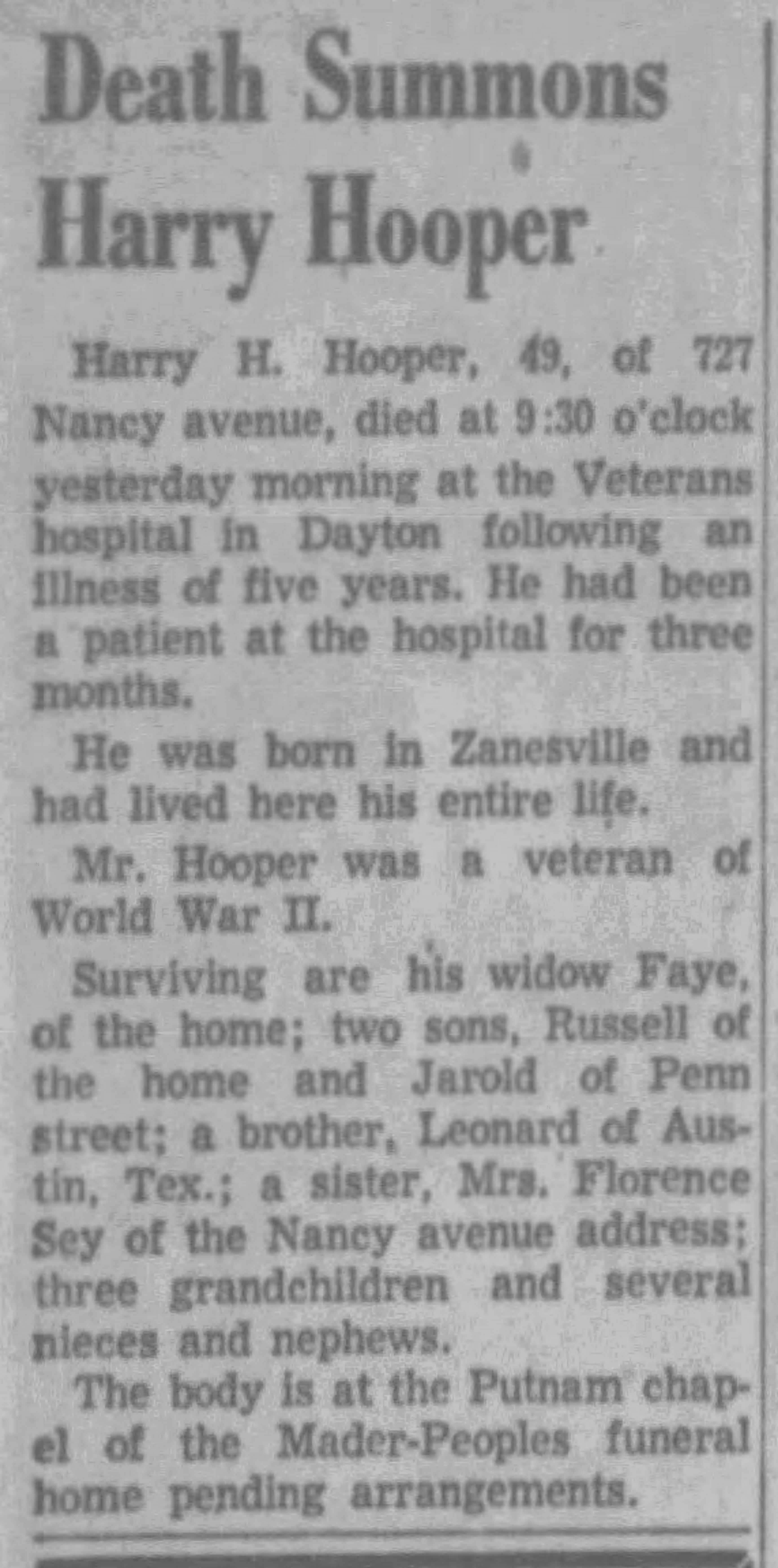 Harry H. Hooper, 49, of 727 Nancy avenue, died at 9:30 o'clock yesterday morning at the Veterans hospital in Dayton following an illness of five years. He had been a patient at the hospital for three months.