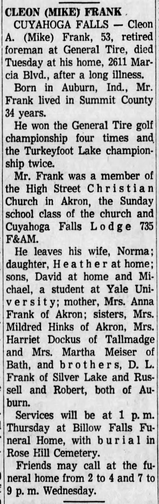 He leaves his wife, Norma; daughter, Heather at home; sons, David at home and Michael, a student at Yale University; mother, Mrs. Anna Frank of Akron; sisters, Mrs. Mildred Hinks of Akron, Mrs. Harriet Dockus of Tallmadge and Mrs. Martha Meiser of Bath, and brothers, D. L. Frank of Silver Lake and Russell and Robert, both of Auburn.