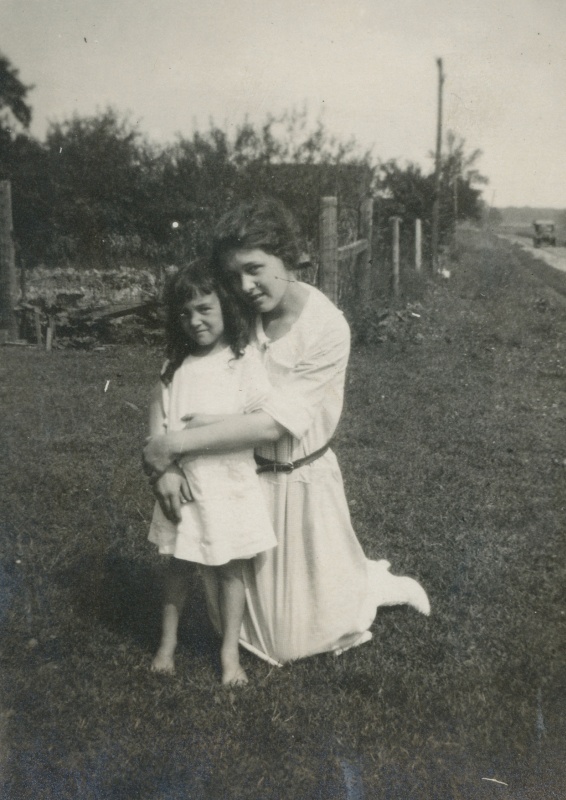 | Mildred Frank's Album: Photo #044 Mildred Frank with her younger sister Harriet. Mildred (Frank) Hinks kept an album of photos glued to black construction paper. These photos were later numbered, and some were described by her husband Amos Hinks. These are primarily from the 1920's and 30's. | ||