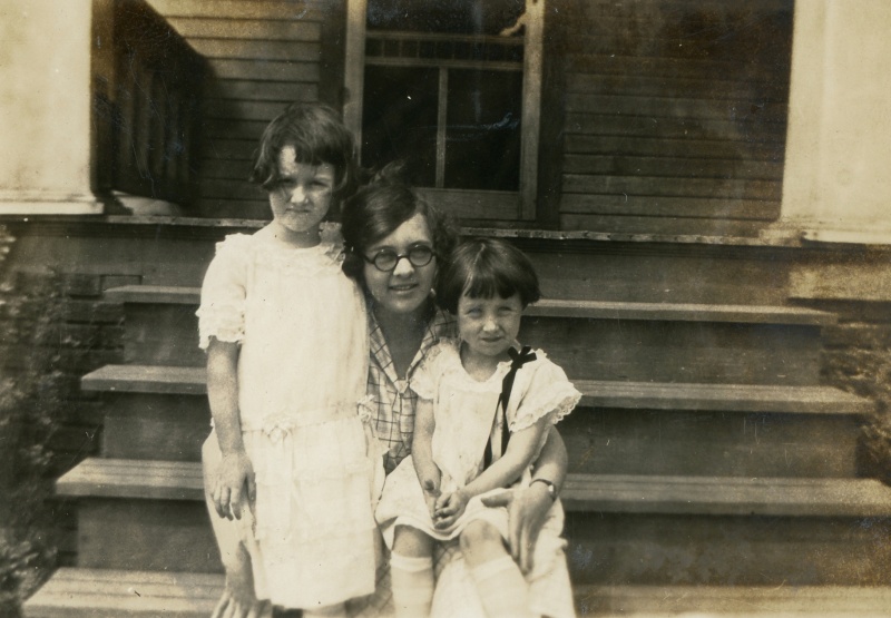 | Mildred Frank's Album: Photo #169 Mildred Frank with neighbor girls at the Urmson home. Mildred (Frank) Hinks kept an album of photos glued to black construction paper. These photos were later numbered, and some were described by her husband Amos Hinks. These are primarily from the 1920's and 30's. | ||