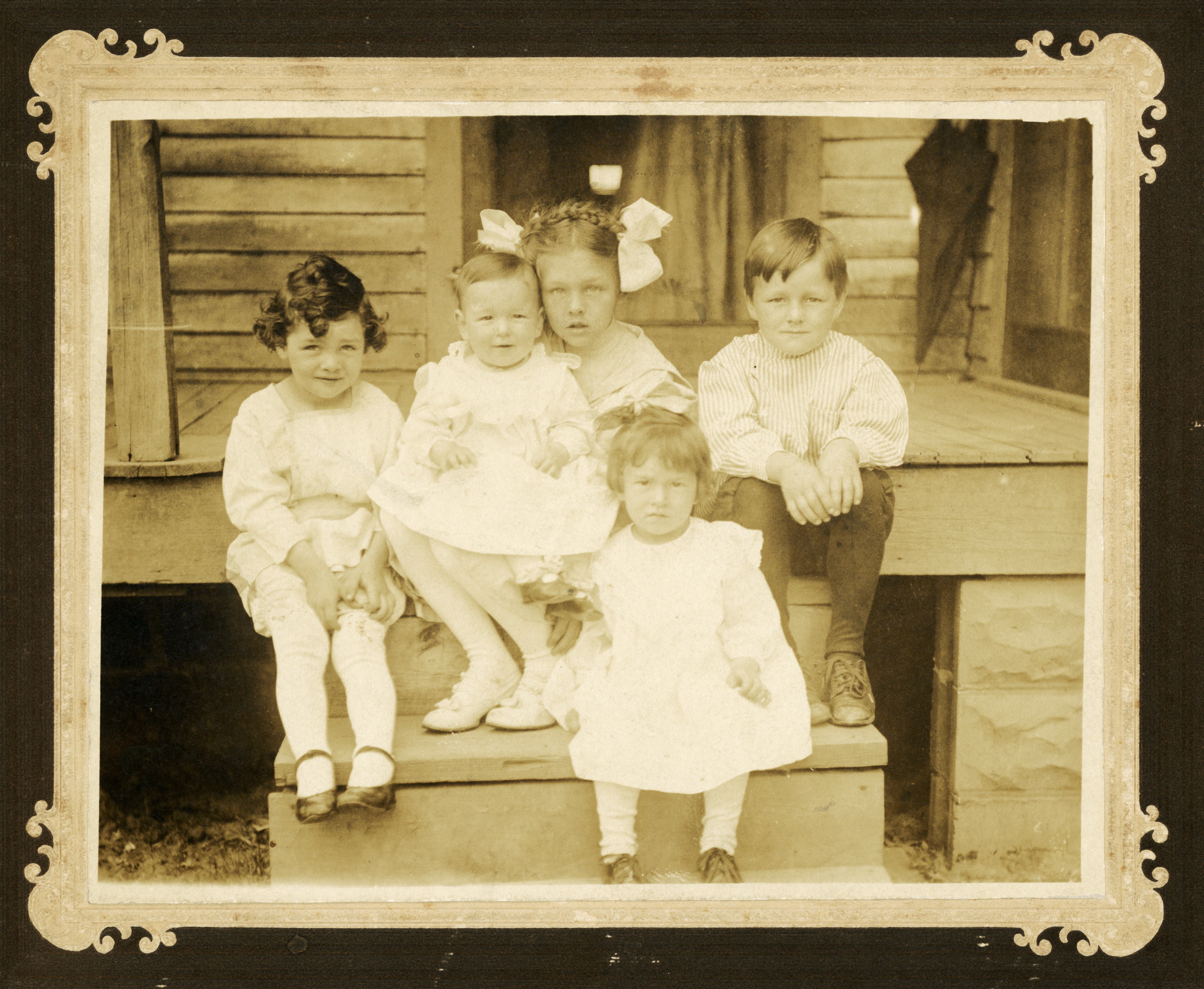 | The Frank Children Writing on the back of this print: Mildred, DeLoss, Russell, Harriett, Robert Frank. This scan has been slightly edited to offset fading. | ||