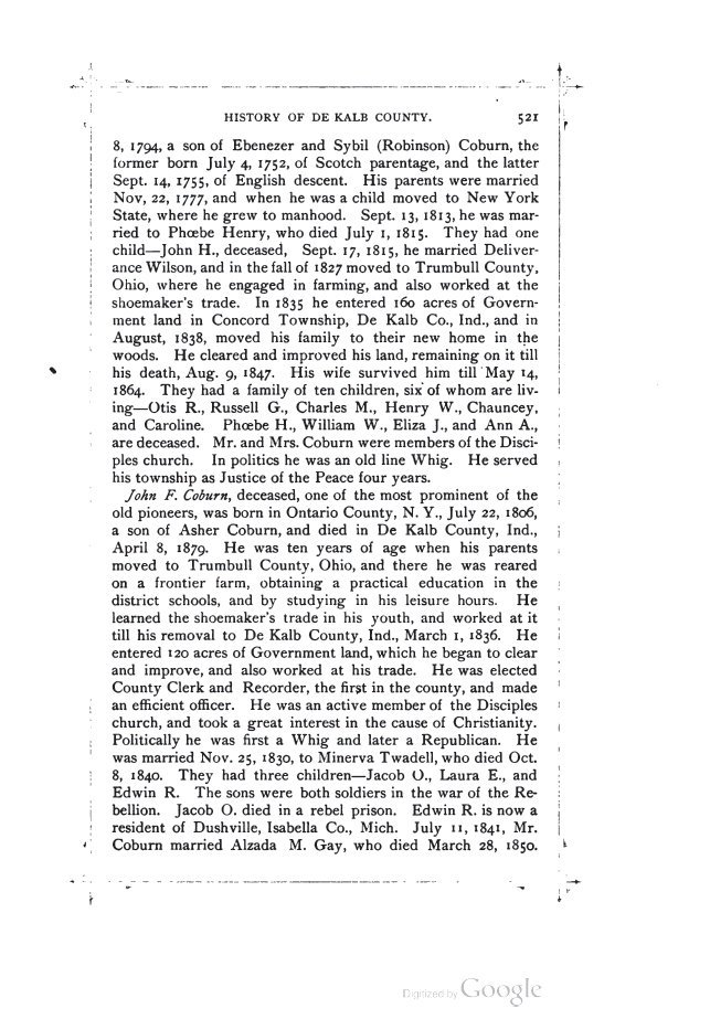 Ebenezer Coburn, deceased, was one of the most esteemed pioneers of De Kalb County. He was born in Vermont, Oct. 8, 1794, a son of Ebenezer and Sybil (Robinson) Coburn, the former born July 4, 1752, of Scotch parentage, and the latter Sept. 14, 1755, of English descent. His parents were married Nov. 22, 1777, and when he was a child moved to New York State, where he grew to manhood. Sept. 13, 1813, he was married to Phoebe Henry, who died July 1, 1815. He married Deliverance Wilson, and in the fall of 1827 moved to Trumbull County, Ohio, where he engaged in farming, and also worked at the shoemaker’s trade. In 1835 he entered 160 acres of Government land in Concord Township, De Kalb Co., Ind., and in August, 1838, moved his family to their new home in the woods. He cleared and improved his land, remaining on it till his death, Aug. 9, 1847. His wife survived him till May 14, 1864. They had a family of ten children, six of whom are living—Otis R., Russell G., Charles M., Henry W., Chauncey, and Caroline. Phoebe H., William W., Eliza J., and Ann A., are deceased. Mr. and Mrs. Coburn were members of the Disciples church. In politics he was an old line Whig. He served his township as Justice of the Peace four years.