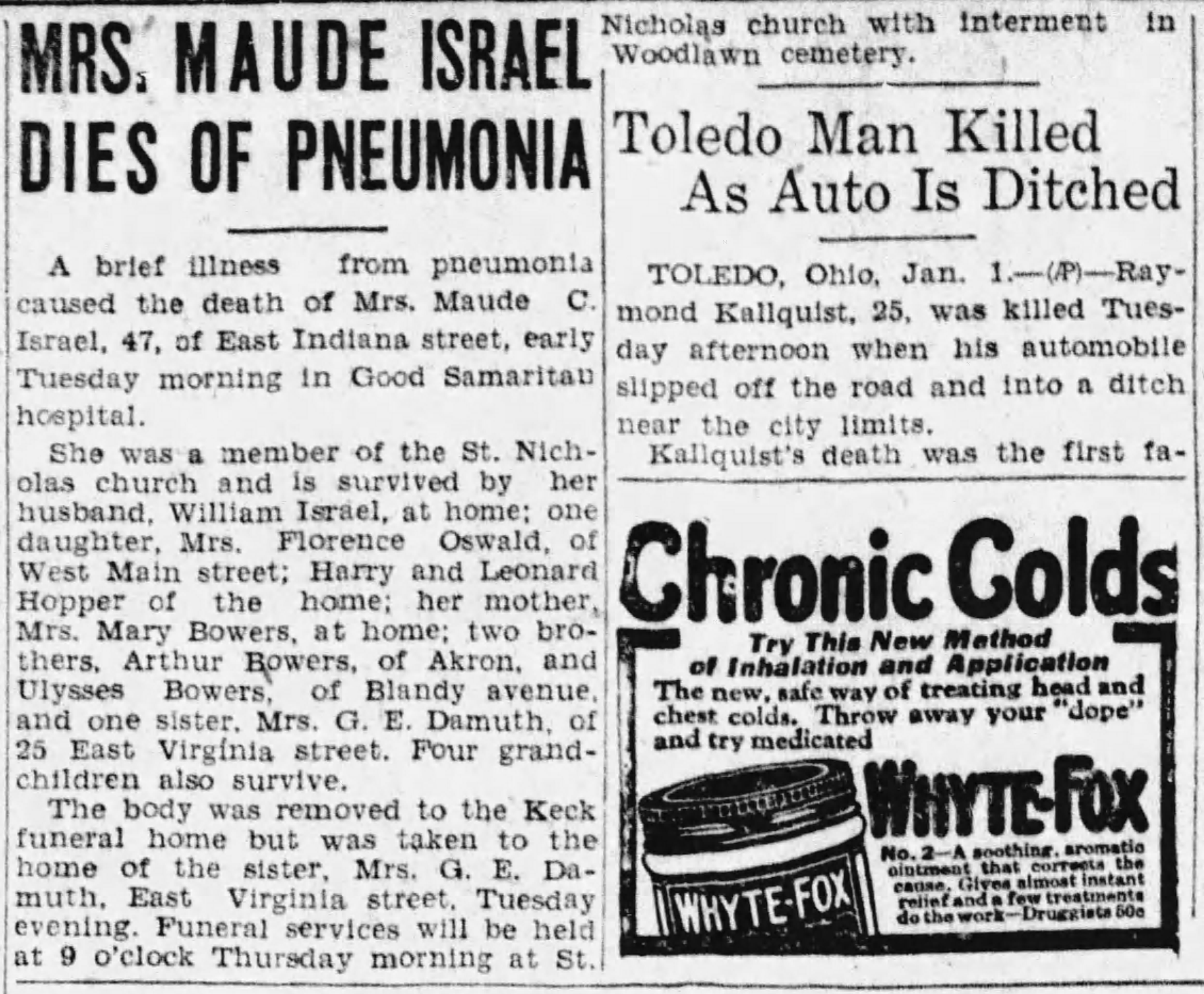 A brief illness from pneumonia caused the death of Mrs. Maude C. Israel, 47, of East Indiana street, early Tuesday morning in Good Samaritan hospital.