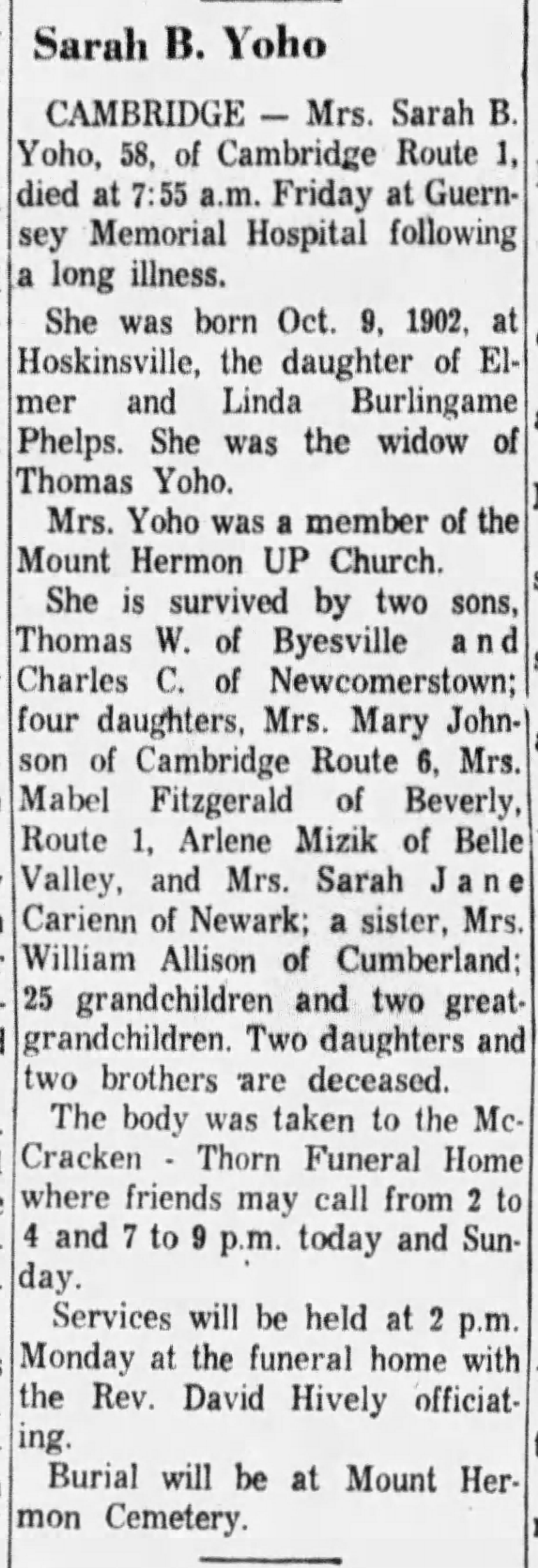 CAMBRIDGE - Mrs. Sarah B. Yoho, 58, of Cambridge Route 1, died at 7:55 a.m. Friday at Guernsey Memorial Hospital following a long illness.