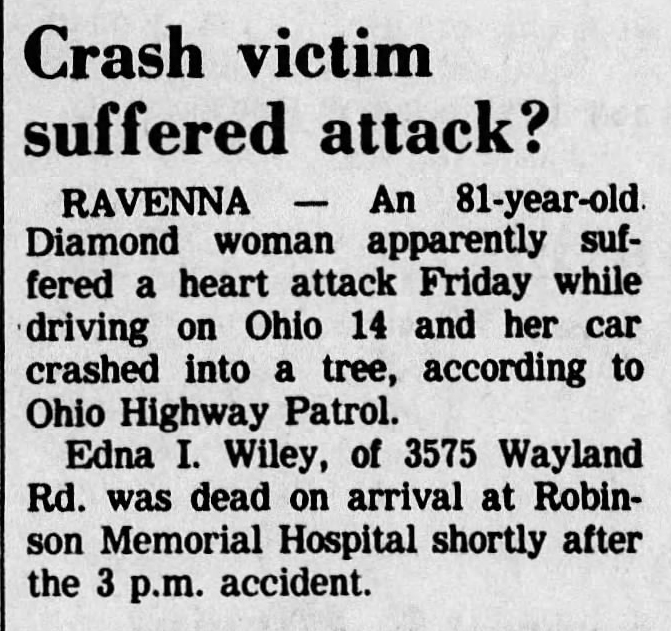 Edna I. Wiley, of 3575 Wayland Rd. was dead on arrival at Robinson Memorial Hospital shortly after the 3 p.m. accident.