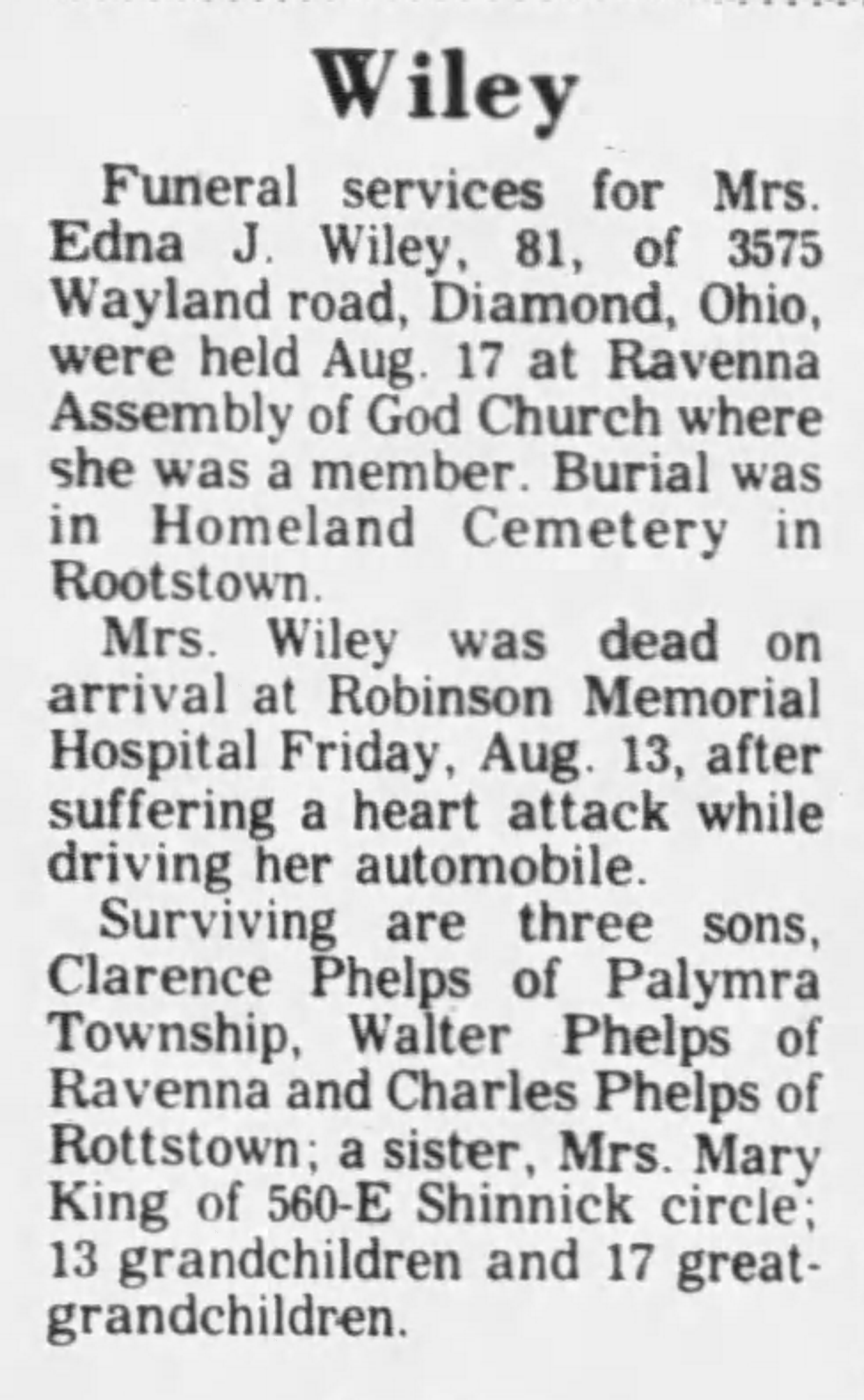 Funeral services for Mrs. Edna J. Wiley, 81, of 3575 Wayland road, Diamond, Ohio, were held Aug. 17 at Ravenna Assembly of God Church where she was a member. Burial was in Homeland Cemetery in Rootstown.