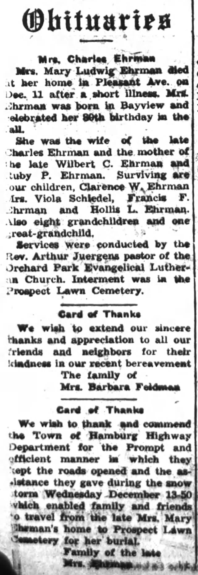 Mrs. Mary Ludwig Ehrman died at her home in Pleasant Ave. on Dec. 11 after a short illness. Mr. Ehrman was born in Bayview and celebrated her 80th birthday in the fall.