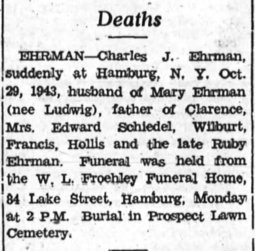 EHRMAN - Charles J. Ehrman, suddenly at Hamburg, N. Y. Oct. 29, 1943, husband of Mary Ehrman (nee Ludwig), father of Clarence, Mrs. Edward Schiedel, Wilbert, Francis, Hollis and the late Ruby Ehrman. Funeral was held from the W. L. Froehley Funeral Home, 84 Lake Street, Hamburg, Monday at 2 P.M. Burial in Prospect Lawn Cemetery.