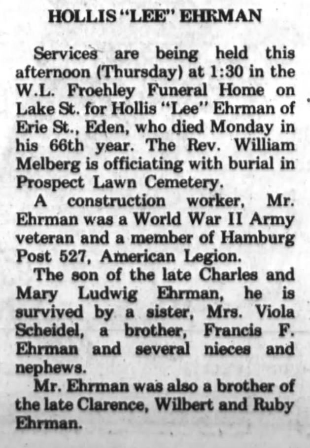 Services are being held this afternoon (Thursday) at 1:30 in the W.L. Froehley Funeral Home on Lake St. for Hollis "Lee" Ehrman of Erie St., Eden, who died Monday in his 66th year. The Rev. William Melberg is officiating with burial in Prospect Lawn Cemetery.