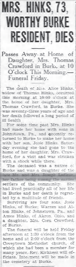 | Burial | 30 May 1930 | Burke, Franklin, New York, USA [2, 22] |