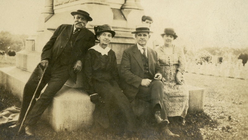 | Mildred Frank's Album: Photo #380 Thomas and Olive (Lafluer) Hinks with Mr. and Mrs. Reese (in-laws). Betty Hinks is hiding in the back. Mildred (Frank) Hinks kept an album of photos glued to black construction paper. These photos were later numbered, and some were described by her husband Amos Hinks. These are primarily from the 1920's and 30's. | ||