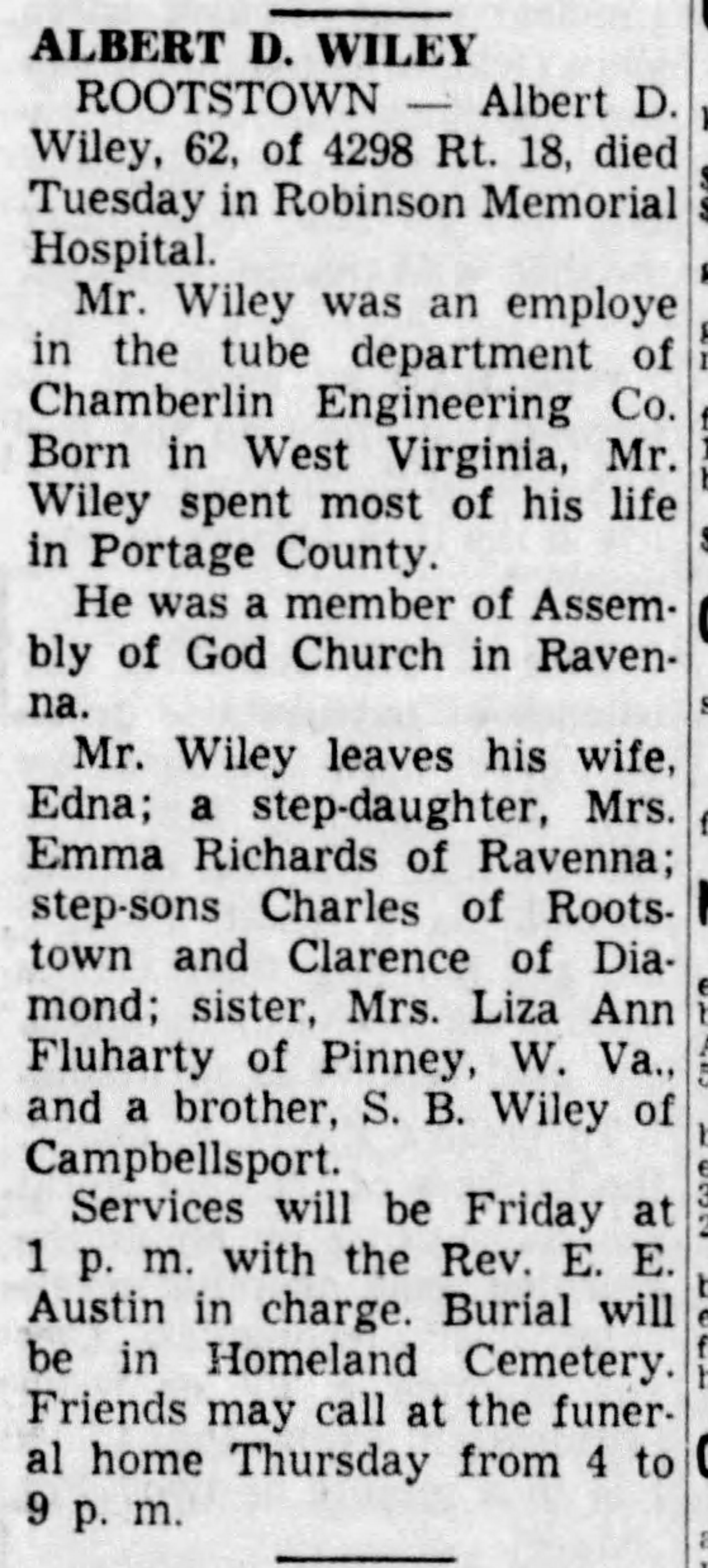 Mr. Wiley leaves his wife, Edna; a step-daughter, Mrs. Emma Richards of Ravenna; step-sons Charles of Rootstown and Clarence of Diamond; sister, Mrs. Liza Ann Fluharty of Pinney, W. Va., and a brother, S. B. Wiley of Campbellsport.