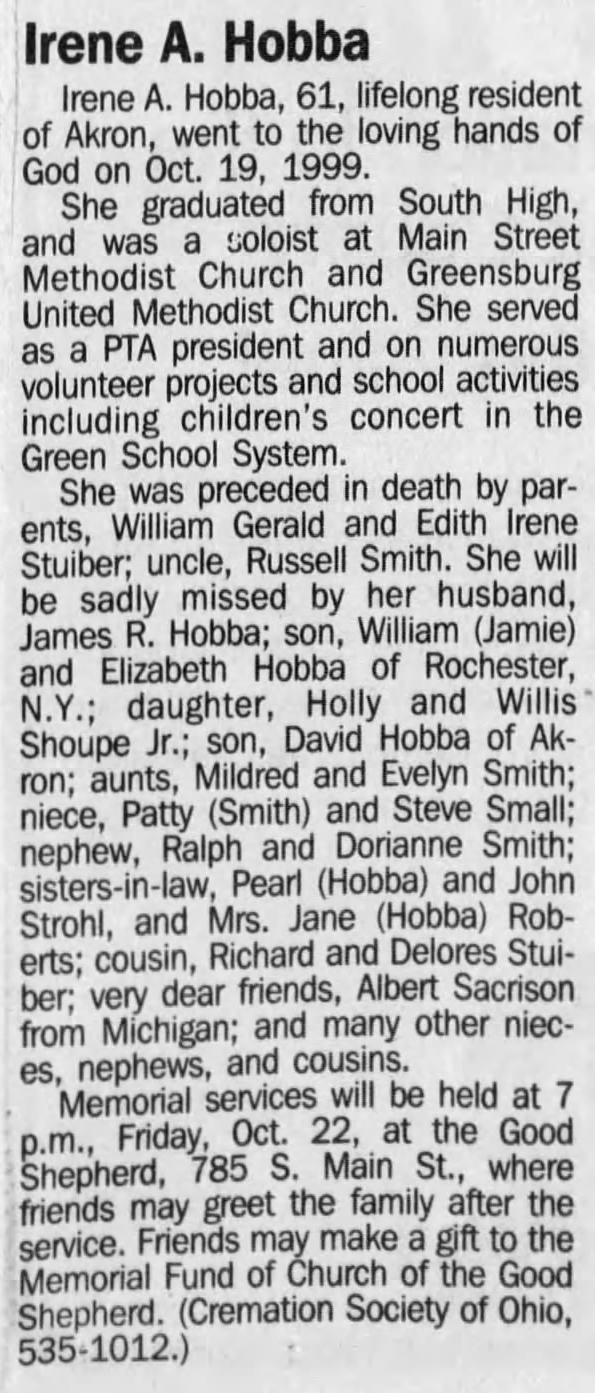 She was preceded in death by parents, William Gerald and Edith Irene Stuiber; uncle, Russell Smith. She will be sadly missed by her husband, James R. Hobba; son, William (Jamie) and Elizabeth Hobba of Rochester, N.Y.; daughter, Holly and Willis Shoupe Jr.; son, David Hobba of Akron; aunts, Mildred and Evelyn Smith; niece, Patty (Smith) and Steve Small; nephew, Ralph and Dorianne Smith; sisters-in-law, Pearl (Hobba) and John Strohl, and Mrs. Jane (Hobba) Roberts; cousin, Richard and Delores Stuiber; very dear friends, Albert Sacrison from Michigan; and many other nieces, nephews, and cousins.