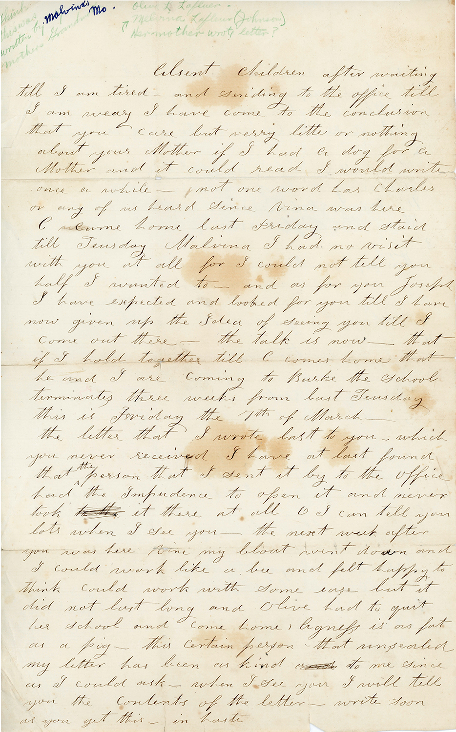| Photos | Letter - Minerva Johnson to Malvina Lafluer A scan of a letter written by Minerva Jacobs to Malvina Johnson. There was no writing on the back, nor a date. |