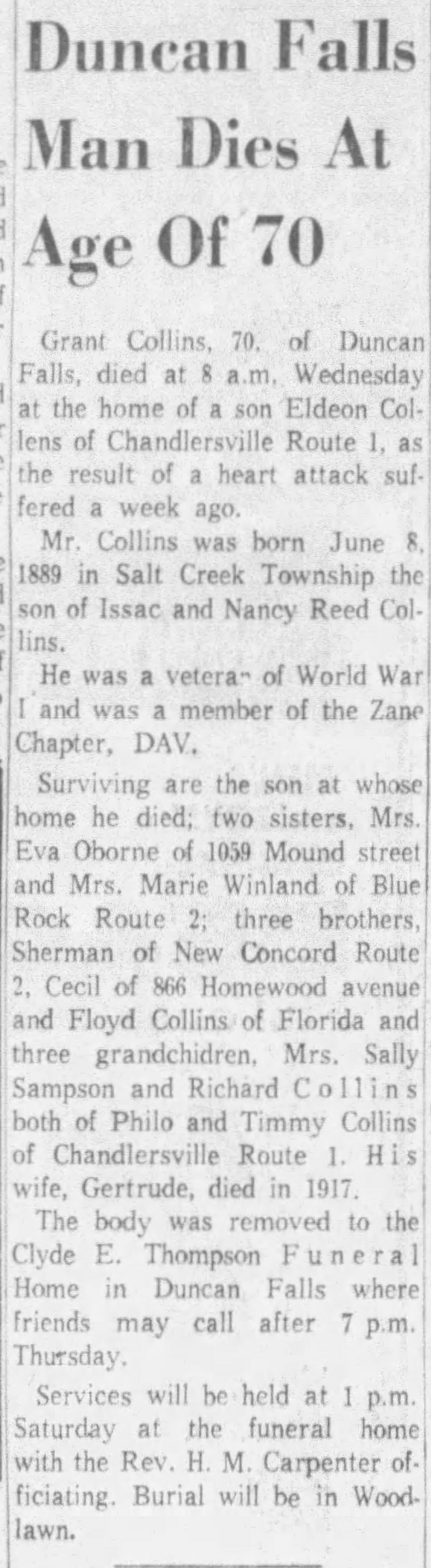 Grant Collins, 70, of Duncan Falls, died at 8 a.m. Wednesday at the home of a son, Eldeon Collins of Chandlersville Route 1, as the result of a heart attack suffered a week ago.