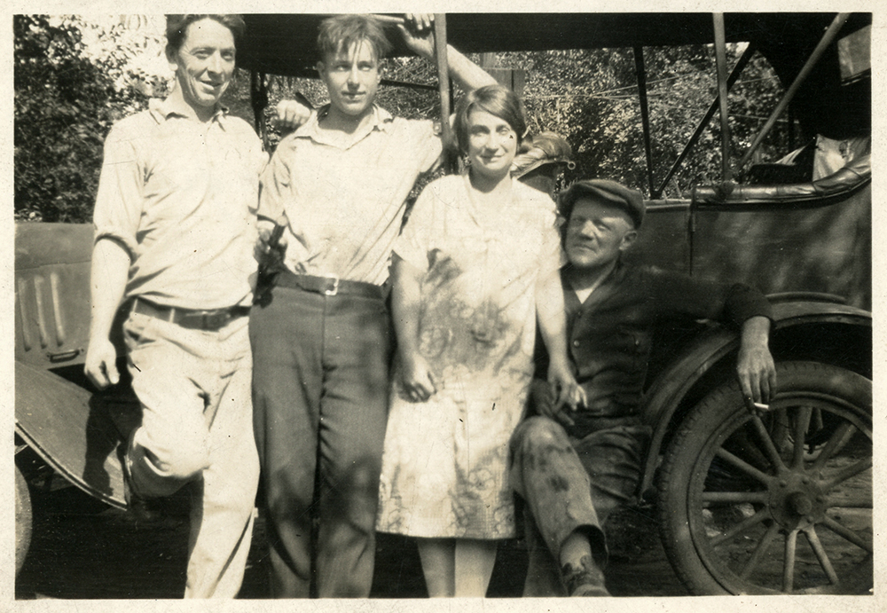 | Working on a Car From left to right: Floyd (friend), Cecil Phelps, Emma Clayberger, Charles G. Clayberger. A note on the back of the print further explains: "Pap working on car & put dirt & grease all over mom. | ||