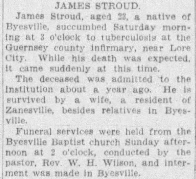 James Stroud, aged 23, a native of Byesville, succumbed Saturday morning at 3 o'clock to tuberculosis at the Guernsey county infirmary, near Lore City. While his death was expected, it came suddenly at this time.