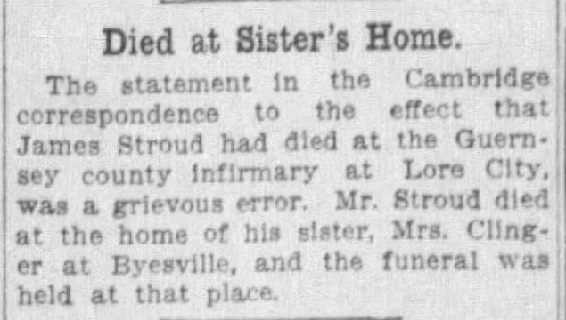 The statement in the Cambridge correspondence to the effect that James Stroud had died at the Guernsey county infirmary at Lore City, was a grevious error. Mr. Stroud died at the home of his sister, Mrs. Clinger, at Byesville, and the funeral was held at that place.--Times Recorder.