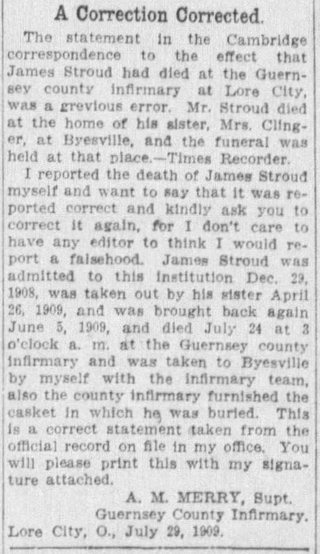 I reported the death of James Stroud myself and want to say that it was reported correct and kindly ask you to correct it again, for I don't care to have any editor to think I would report a falsehood. James Stroud was admitted to this institution Dec. 29, 1908, was taken out by his sister April 26, 1909, and was brought back again June 5, 1909, and died July 24 at 3 o'clock a. m. at the Guernsey county infirmary and was taken to Byesville by myself with the infirmary team, also the county infirmary furnished the casket in which he was buried. This is a correct statement taken from the official record on file in my office. You will please print this with my signature attached.